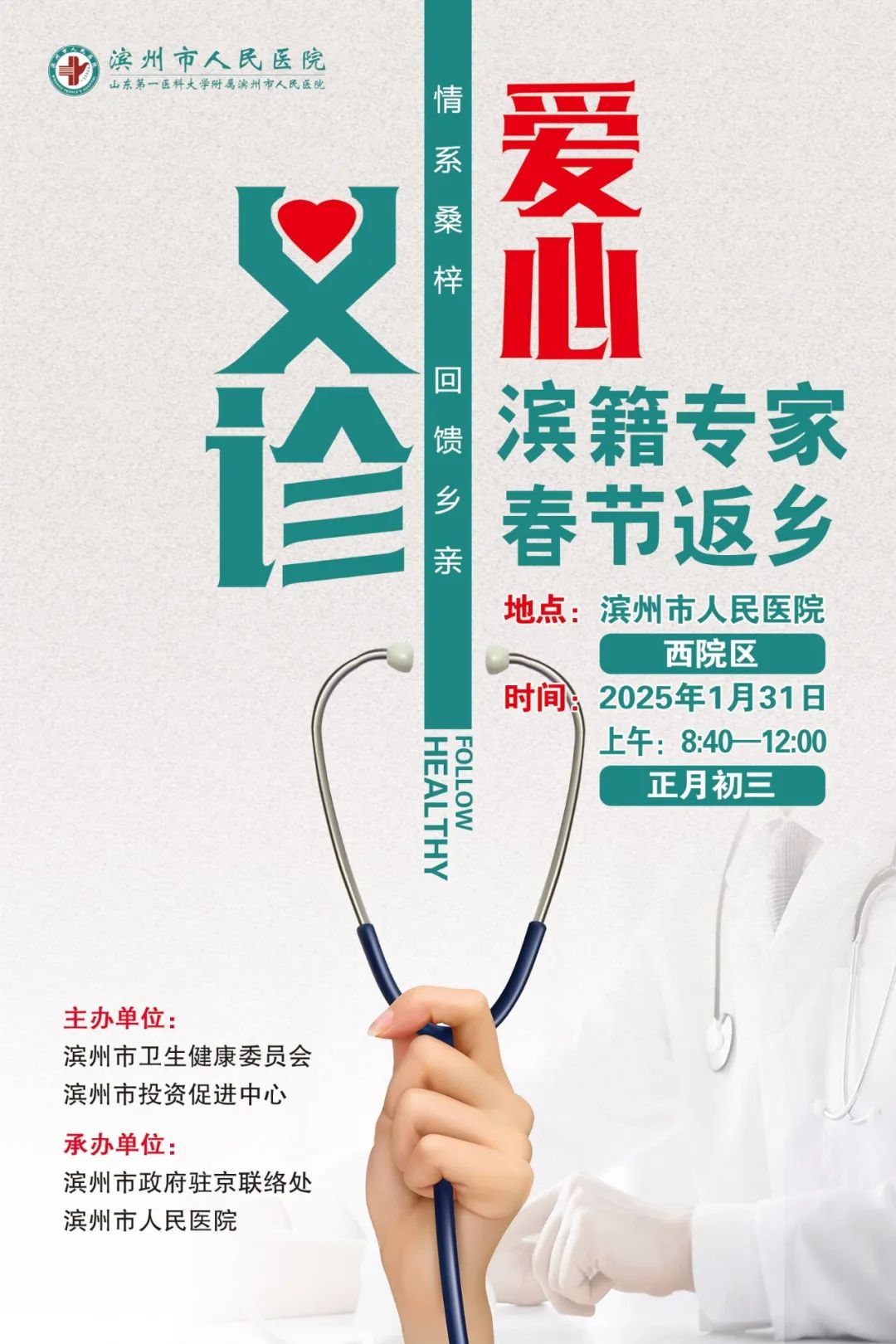 对于家乡的亲人们来说,这是一次难得的在家门口就能享受顶级医疗资源的机会。无需长途奔波,就能与权威专家面对面交流,让健康多一份保障。如果您或您的家人身体不适,或是有健康方面的困扰,不妨抓住这次机会,在这个新春佳节,让这份“健康礼”为您和家人的幸福生活筑牢根基。活动当天,请提前到达滨州市人民医院西院区,有序参与义诊。