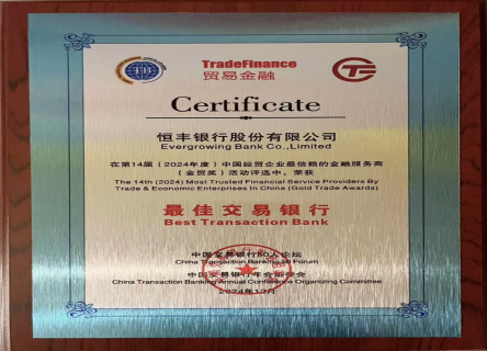 近日,第14届中国经贸企业最信赖的金融服务商(金贸奖)评选结果揭晓。恒丰银行凭借在贸易金融、跨境金融、供应链金融、现金管理、支付结算等业务领域的卓越表现,成功荣膺“最佳交易银行”奖项。