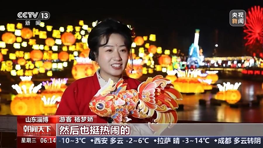 逛灯会,赏花灯,是春节的一项传统民俗。在山东淄博,120多组大型花灯点亮,吸引了众多游客。