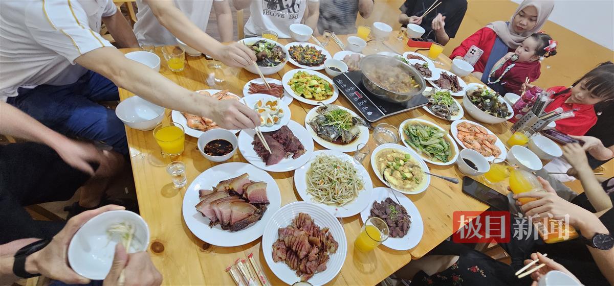 “昨天我和父母以及餐馆的师傅,大家十多人一起吃了团年饭,还观看了央视春晚。今天大年初一,带父母去逛了街。”黄先生给记者发来了团年饭的照片,满满一大桌菜多达20个菜品,十分丰盛。他说,其中腊肉和香肠等家乡味道都是父母特地从襄阳带过来的。