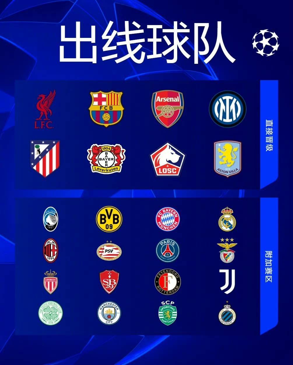 因此附加赛潜在对阵分别为:摩纳哥/布雷斯特vs巴黎/本菲卡;葡萄牙体育/布鲁日vs亚特兰大/多特;凯尔特人/曼城vs皇马/拜仁;费耶诺德/尤文vsAC米兰/埃因霍温。