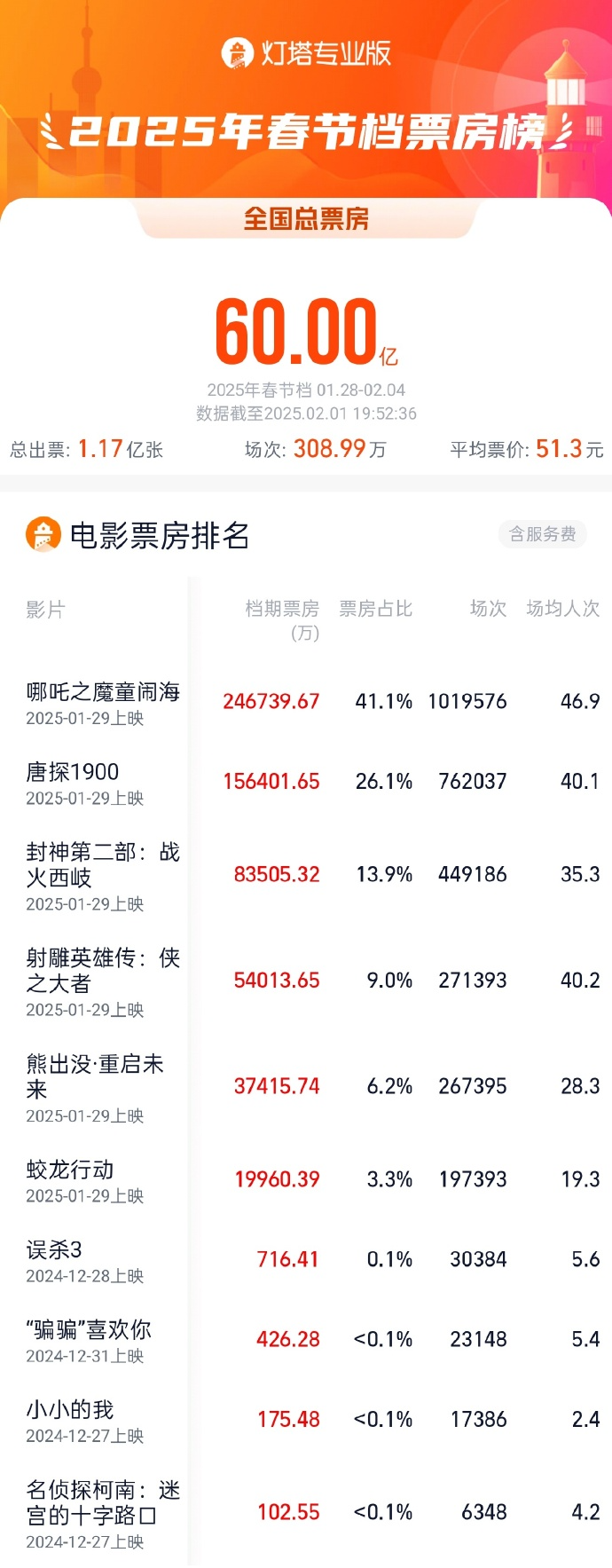 2025春节档票房超60亿! 大众报业·齐鲁壹点 2025-02-01 1.2万 据网络平台数据,截至2月1日19时52分,2025年春节档(1月28日-2月4日)档期总票房(含预售)突破60亿。 据灯塔专业版数据,截至2月1日16时50分,2025大年初四单日票房破10亿,春节档已连续4天单日大盘票房破10亿。 (央视新闻) 责任编辑:帅为