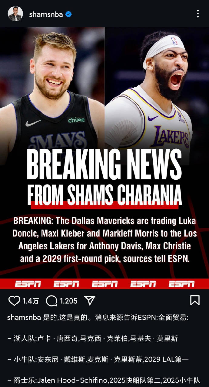 在消息刚刚被曝出之后,很多人都不相信这是真的,因为这个消息着实令人震惊。但随后“沃神”的接班人沙姆斯披露了转会内幕和交易详情,球迷们这才确信。具体的交易细节不仅涉及湖人和独行侠两支球队和俱乐部,爵士也在其中:湖人得到东契奇、克勒贝尔、马基夫·莫里斯;独行侠得到戴维斯、克里斯蒂和2029年首轮签;爵士得到席菲诺、快船的2025年次轮、独行侠的2025年次轮签。