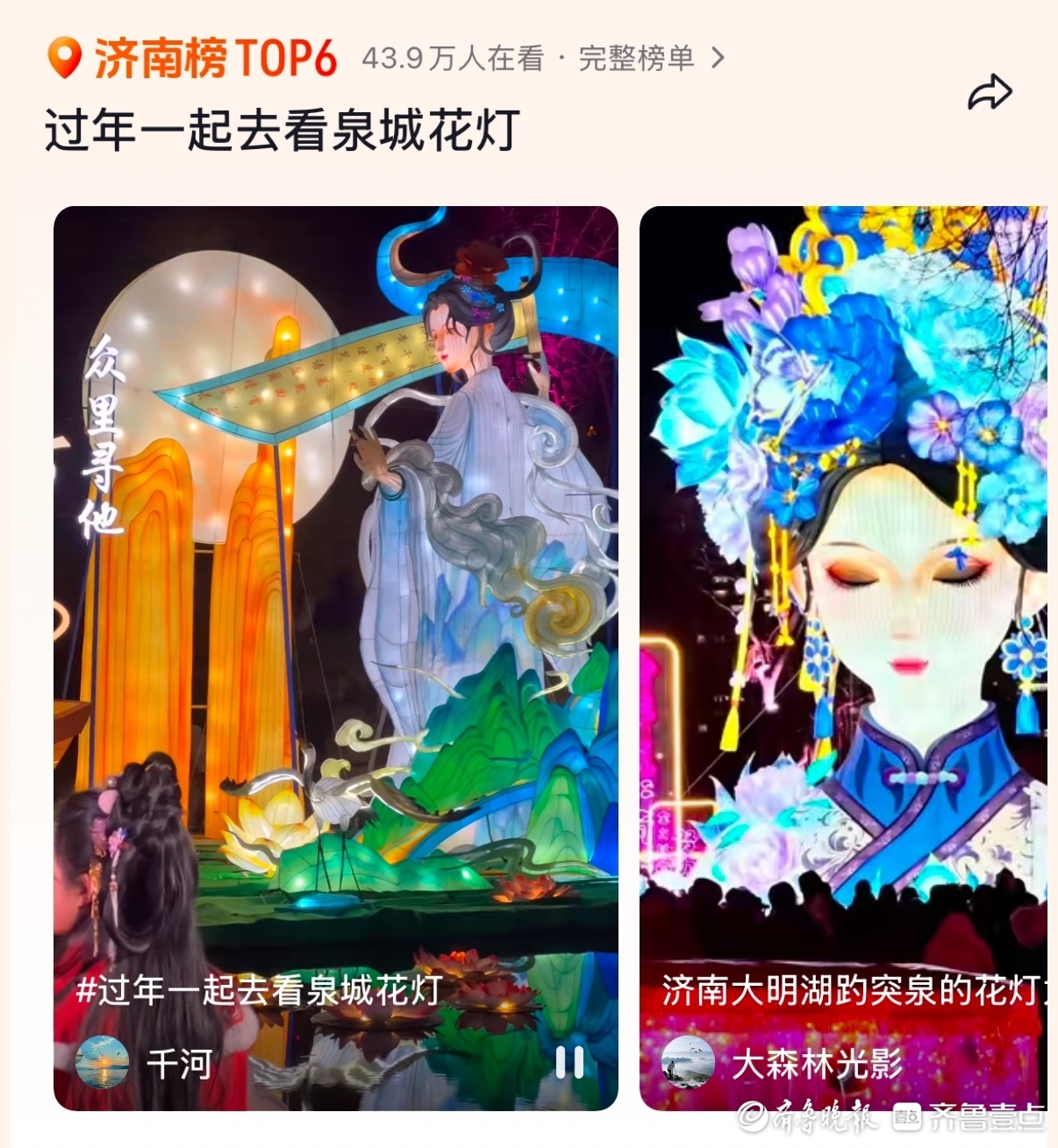 数据是最好的证明。在花灯会等节庆活动的加持下,截至2月2日14时,济南市30家重点监测景区共接待游客65.13万人次。其中天下第一泉景区接待游客33.4万人次,可以说是稳居济南景区“顶流”之位;在某短视频平台,“过年一起去看泉城花灯”登上济南热榜top6,截至2月2日17时25分已有43.9万人在看。