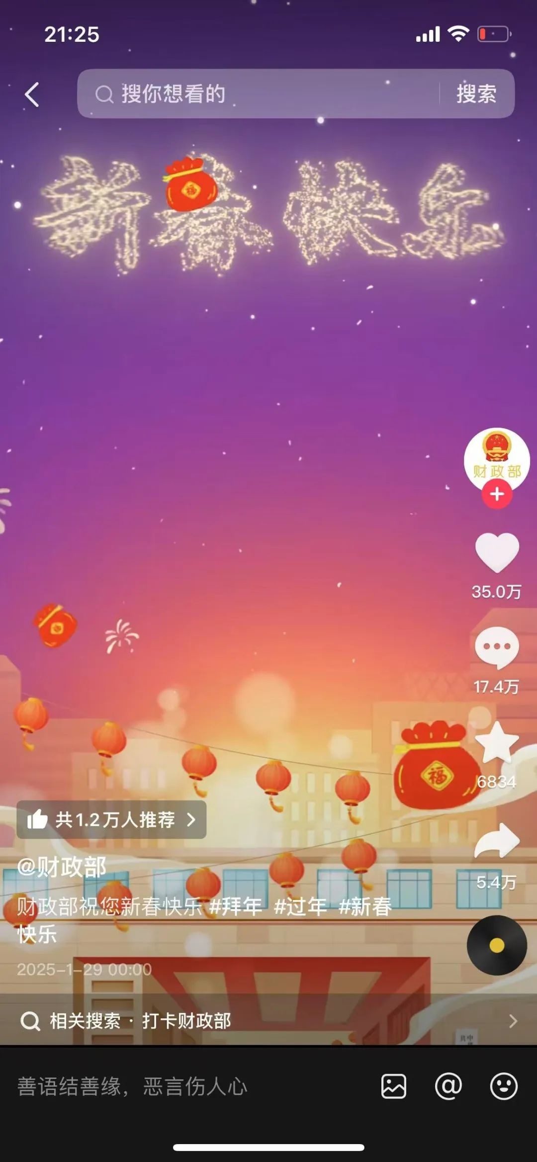 澎湃新闻记者注意到,大年初五这一天,财政部官方视频号、抖音号涌入大量网民前来打卡“许愿”。截至2日晚上9时许,财政部官方抖音号的拜年视频已经有35万次点赞,超17万条留言。