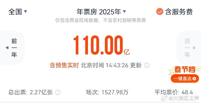 2025年度电影票房破110亿!你看了哪部? 央视新闻 2025-02-04 9945 据网络平台数据 截至2月4日14时43分 2025年度票房(含预售实时)破110亿 截至2月4日10时 2025年春节档总观影人次 突破1.7亿 超2024年春节档总观影人次 刷新中国影史春节档观影人次纪录! 此外 2025年中国电影市场累计票房 超北美票房成绩 位列全球第一 (央视新闻) 责任编辑:崔可腾