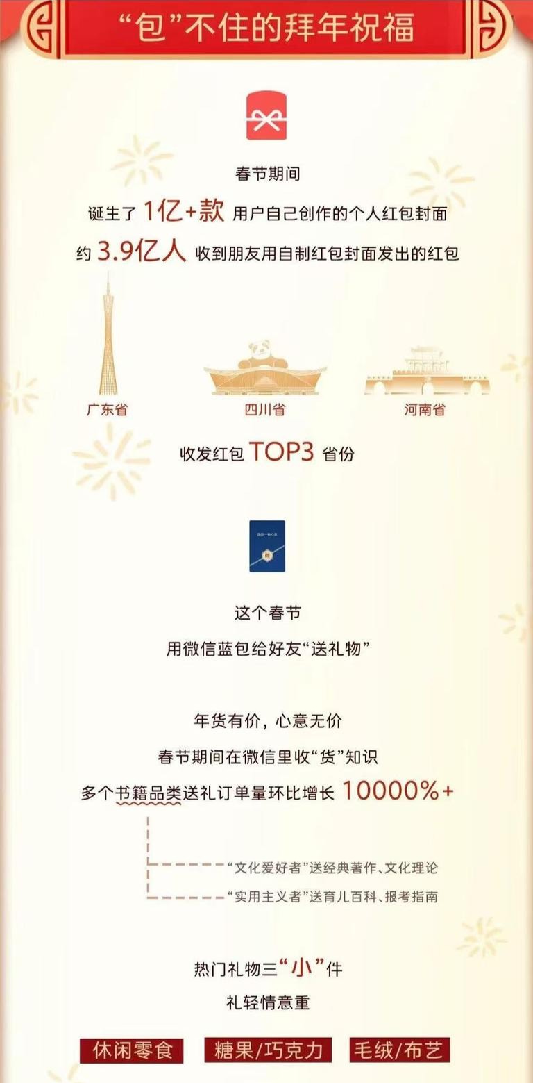报告显示:春节期间,微信里共诞生了1亿+款用户自己创作的红包封面,约有 3.9 亿人收到含有这些红包封面的红包,收发红包前三的省份分别是广东省、四川省、河南省;今年微信蓝包带来春节首秀,春节期间,在微信里为朋友“送礼物”的需求旺盛,收到礼物数目最多的省份前三甲是广东省、山东省、浙江省;书籍作为黑马选手,成为许多人的送礼首选,包含经典著作、育儿百科在内的多个书籍品类送礼订单量环比增长10000%+。