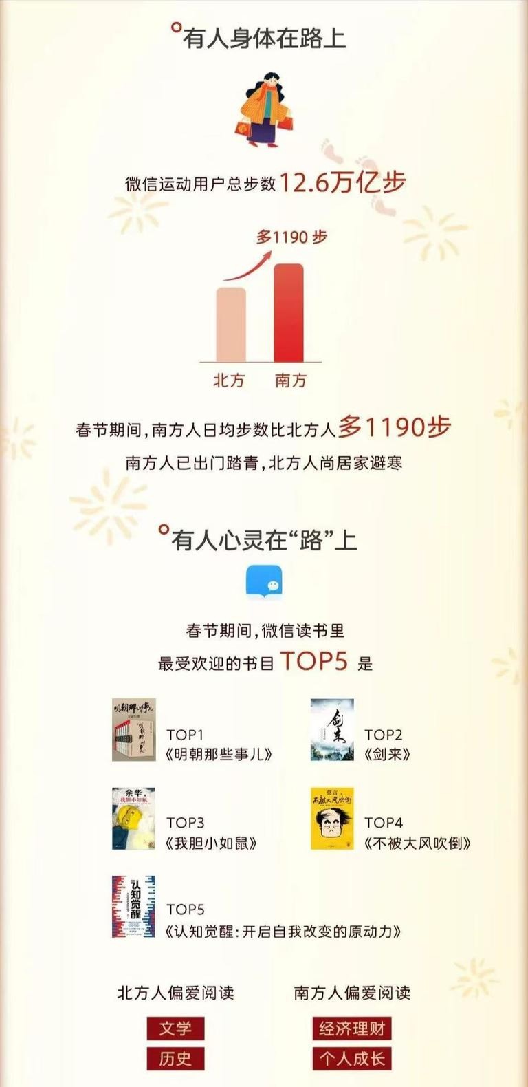 微信运动用户总步数超12.6万亿步,南方人日均步数比北方人多1190步,南方人出门踏青,北方人居家避寒。读书也成为许多人假期充电的方法,在微信读书平台上,南北方人民读书的类型也有不同侧重,北方人更偏爱文学、历史类书目,南方人则偏爱经济理财、个人成长类书目。