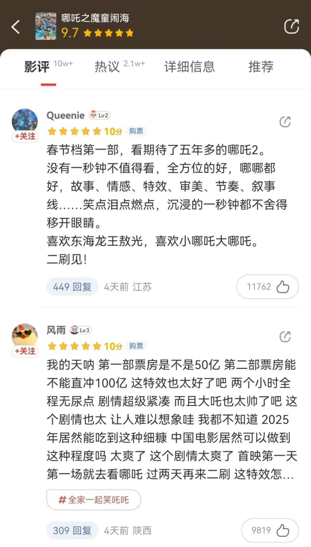 《哪吒2》的火爆不仅体现在票房上,更引发了网络上的广泛讨论。许多观众在社交平台上分享观影体验,表示这部电影不仅是一部动画片,更是一部具有深刻社会意义的作品。影片中的一些情节和台词,如“人心中的成见是一座大山,任你怎么努力也休想搬动”,引发了观众的共鸣。这种良好的口碑助推了票房的持续攀升,也让《哪吒2》成为今年春节档的热门话题。