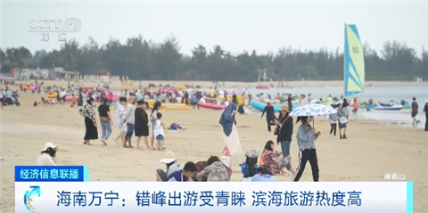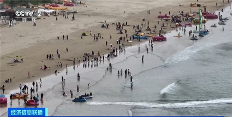 中午时分,在海南万宁神州半岛景区,来到海边的游客依然络绎不绝,或漫步沙滩,或体验冲浪,各个年龄段的游客都能找到适合的亲水项目。
