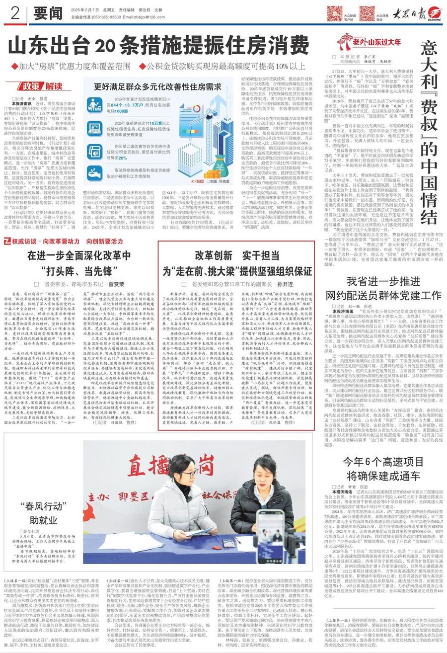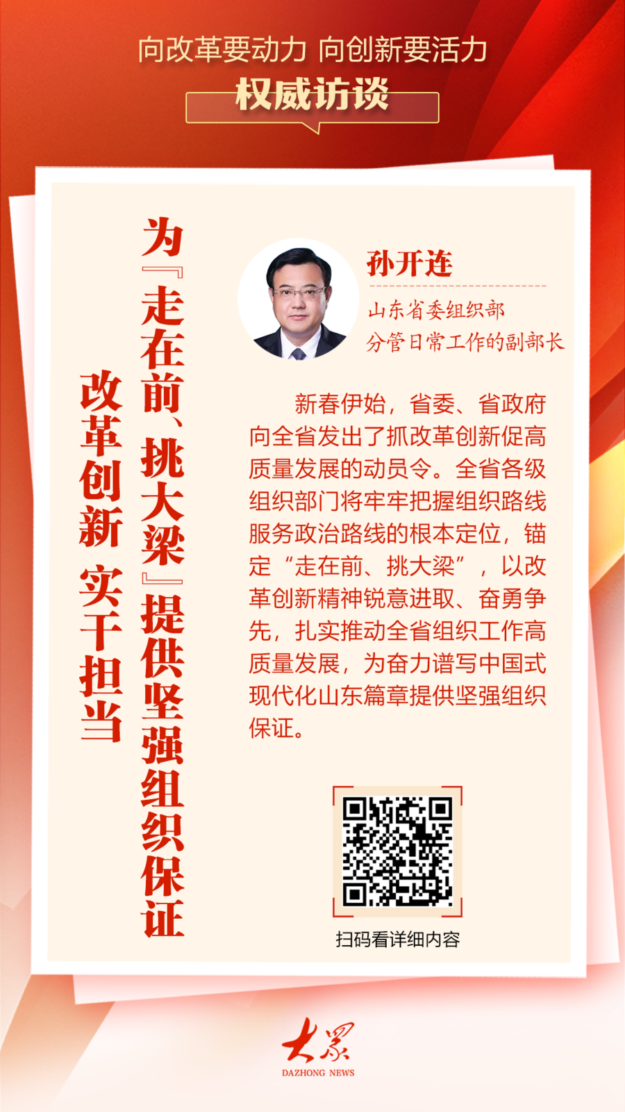新春伊始,省委、省政府向全省发出了抓改革创新促高质量发展的动员令。全省各级组织部门将牢牢把握组织路线服务政治路线的根本定位,锚定“走在前、挑大梁”,以改革创新精神锐意进取、奋勇争先,扎实推动全省组织工作高质量发展,为奋力谱写中国式现代化山东篇章提供坚强组织保证。