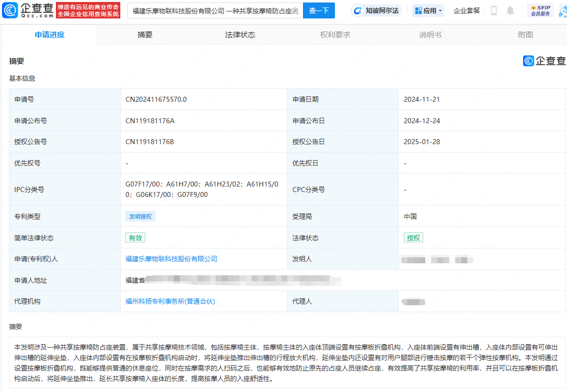 企查查信息显示,该公司近日一项“一种共享按摩椅防占座装置”专利获授权。摘要显示,该发明通过设置按摩板折叠机构,既能够提供普通的休息座位,同时在按摩需求的人扫码之后,也能够有效地防止原先的占座人员继续占座。