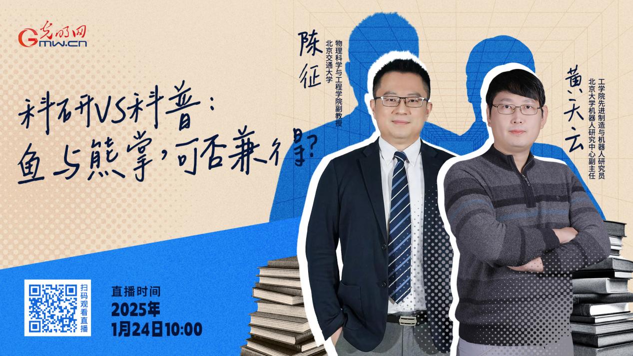 近期,光明网推出青年科学家圆桌访谈,主题为“科研VS科普:鱼与熊掌,可否兼得?”,邀请北京大学机器人研究中心副主任、工学院先进制造与机器人系研究员黄天云,北京交通大学物理科学与工程学院副教授陈征做客直播间,共话科研科普两翼齐飞,探究知识破圈传播之道。