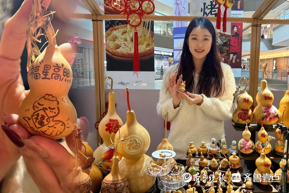 “今年新春,八仙葫芦能走进商场,对我们来说是一次难得的机会。首先,冬季室外气温低,相比室外街区,商场客流大,受众面广,能让不同年龄段的人都接触到非遗,拉近了非遗与百姓之间的距离。”宋梦璐说,“其次,作为年轻的非遗代表性传承人,我也致力于开拓年轻人的市场。今年,葫芦烙画有机会走进商场,我认为更要将非遗与现代商业元素相结合,开发更具有时代感的文创,促进非遗经济价值转化。于是,我将面塑或陶瓷与葫芦相结合做了可爱的‘葫芦娃’,还自制了葫芦挂件和手串,承载了美好的寓意。”