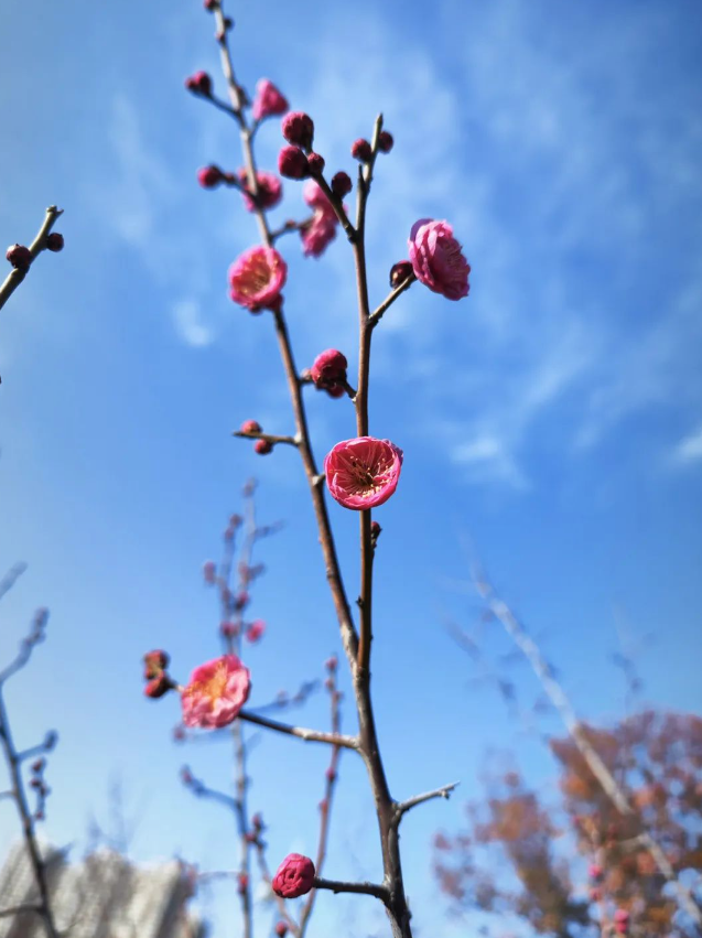 西流湖畔,晴云阁旁,2000多亩的梅花正次第绽放,红梅艳丽,白梅清瘦,绿萼梅娇俏……虽然只有零星的几朵,需要在众多的花骨朵中寻找,恰似春日里的点点繁星,闪烁着希望的光芒,散发着悠悠的清香。