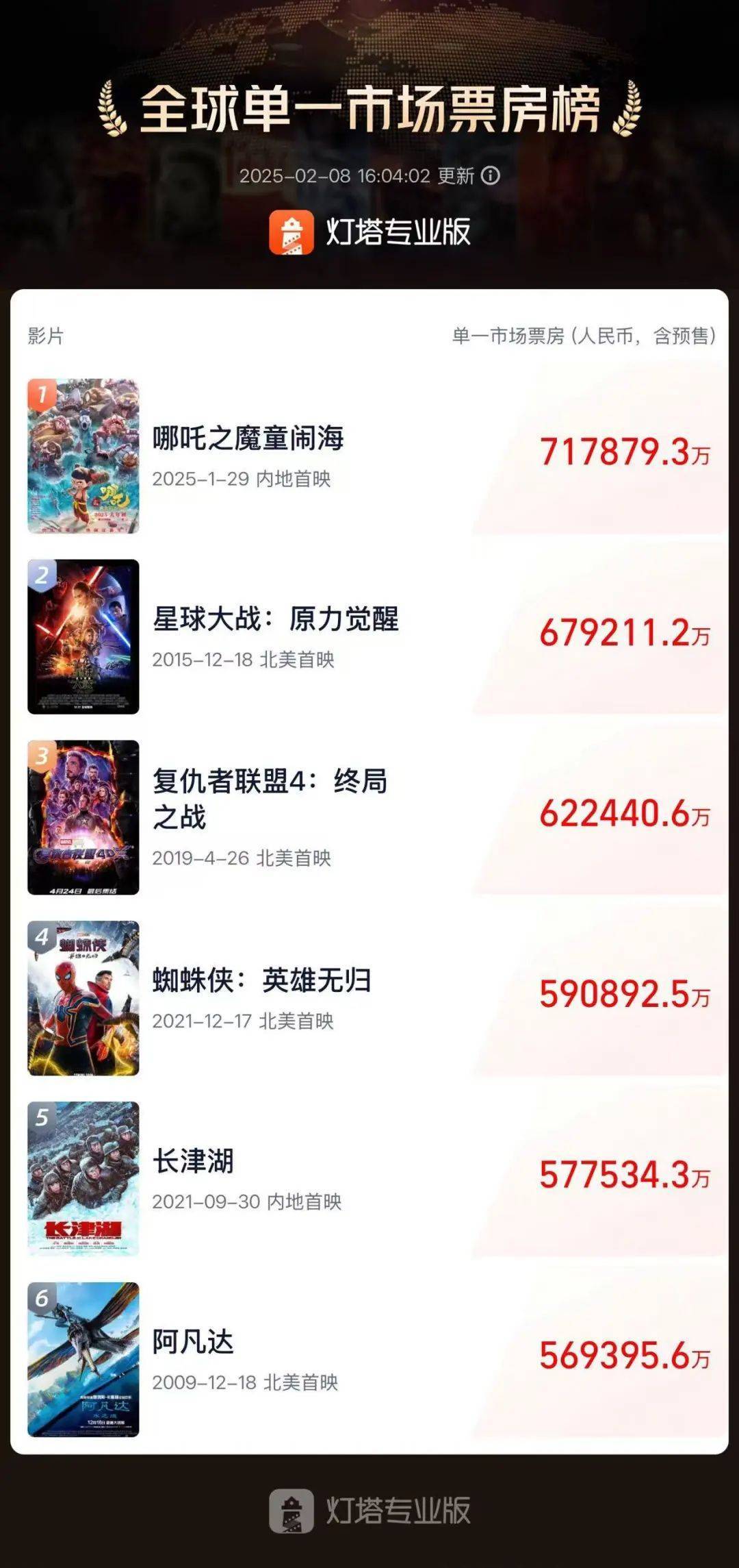 2月7日21点,《哪吒2》票房(含预售),突破67.922亿元,超过《星球大战:原力觉醒》票房成绩,登顶全球影史单一市场票房榜。2月8日上午,@电影哪吒之魔童闹海 发布《全球单一市场票房冠军》海报,配文称“从起点到如今,皆因你们而有奇迹。”