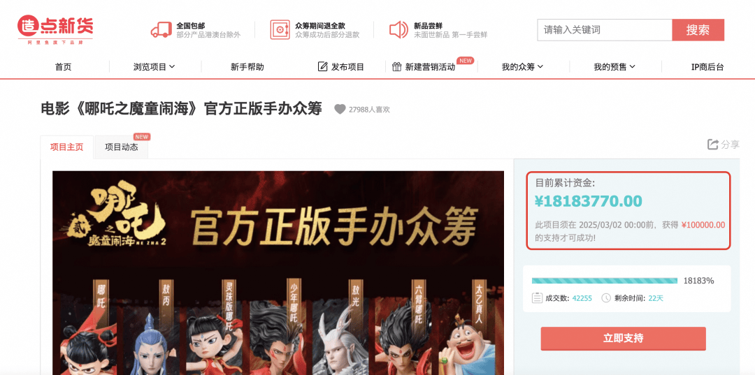 除了已经在售的周边商品,FunCrazy塑料主义、阿里鱼旗下品牌“造点新货”也在淘宝上发起了周边众筹项目,获取官方授权并达到目标众筹金额后,不仅能够“发车”出更丰富的周边样式,参与众筹的网友也能通过众筹价格购买,还可以获得加赠的徽章、贴纸套装、胶片卡等同系列周边。目标筹款10万元的众筹手办,目前在淘宝已经众筹到超过1800万元。