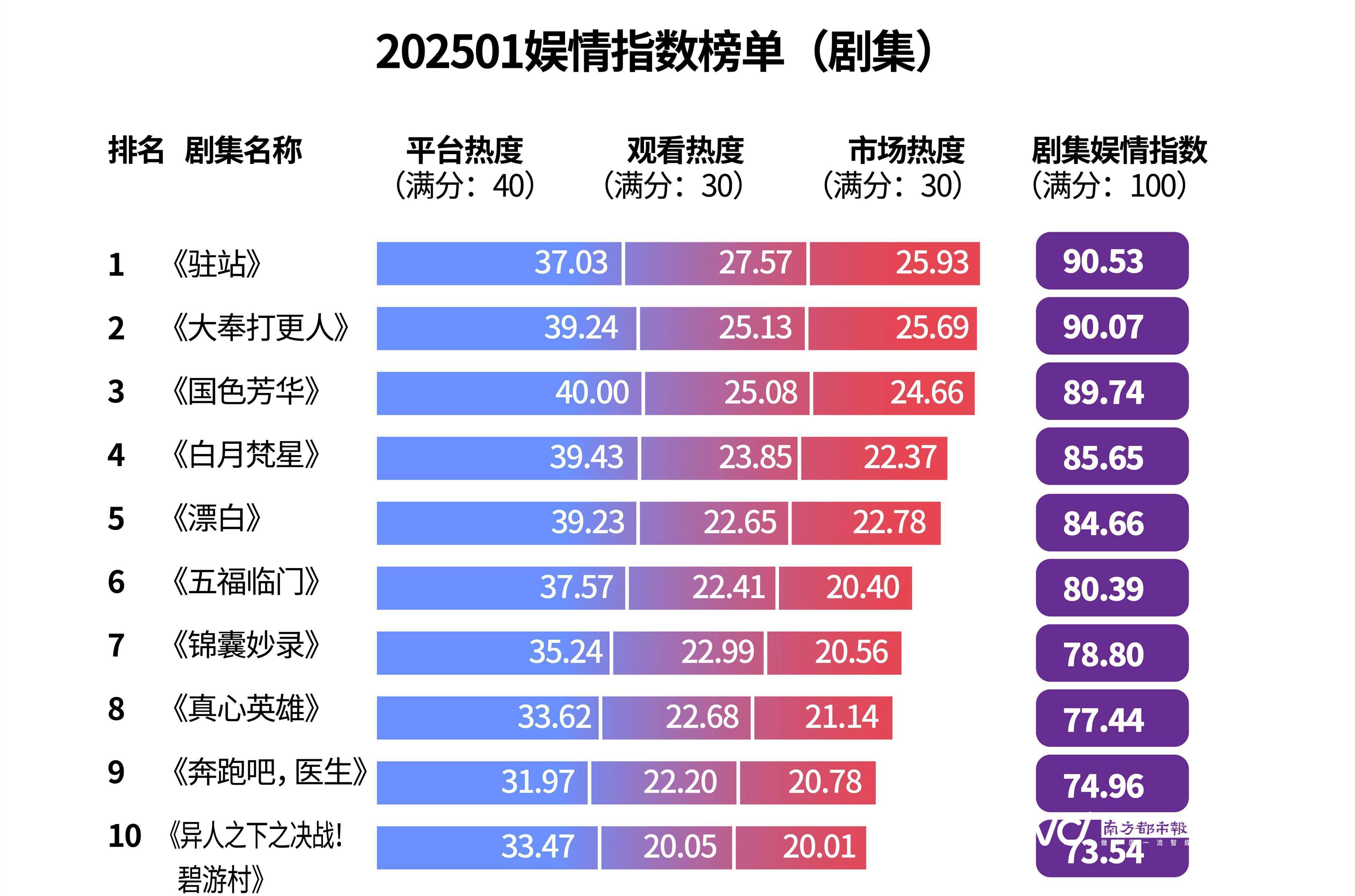 在剧集方面,迎来大结局的《大奉打更人》依然人气高企,凭借在各维度上的平均表现连续两个月排名分榜第二。多部人气剧集纷纷冲入前十。由中央电视台、上海腾讯企鹅影视文化传播有限公司等出品的公安题材轻喜剧《驻站》甫一上榜便占据榜首,自开播以来,收视峰值高达3.783%、收视份额15.654%,首周平均收视3.177%、第二周平均收视3.198%,均以明显优势领跑。由丁梓光执导、杨紫、李现等主演的古装剧《国色芳华》同样表现出色,收获最高平台热度,省级卫视收视率等指标也一路走高,力压一众竞争对手进入三甲。由爱奇艺出品,改编自小说《白烁上神》的《白月梵星》则在网站播放量方面异军突起,首播当日热度7466,破爱奇艺近三年首日热度纪录;截至2025年1月底,该剧在爱奇艺站内热度值破9600,成为该平台近两年古偶冠军,全网有效播放量更突破10亿,跻身剧集分榜前四。人气漫改剧《异人之下》第二季《异人之下之决战!碧游村》也在1月开播,虽然口碑不俗,豆瓣开分8.2,创下漫改剧最高开分纪录,但受累于播放量与曝光度相对较低,播出热度也未达预期,最终排在剧集分榜第十位。