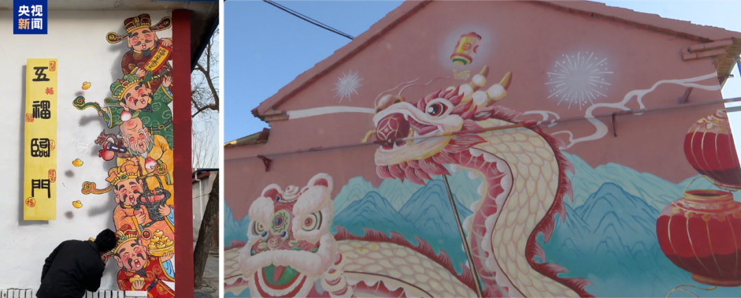 这些年,每逢春节,沈靖宇都会用墙画装扮家乡。去年,他在墙壁上画上了生肖龙,今年,他又创作了“五福临门”等作品。