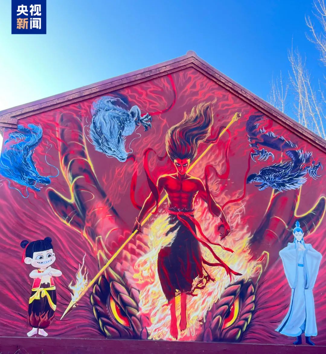 沈靖宇介绍,2019年,他因一句“我命由我不由天”被电影《哪吒》圈粉。“作为年轻人,我希望自己能像哪吒一样,通过努力改变现状。”于是,2025年春节前夕,电影《哪吒2》上映前,沈靖宇参照电影海报,用墙绘的方式为“偶像”助力,也为家乡增添节日氛围。