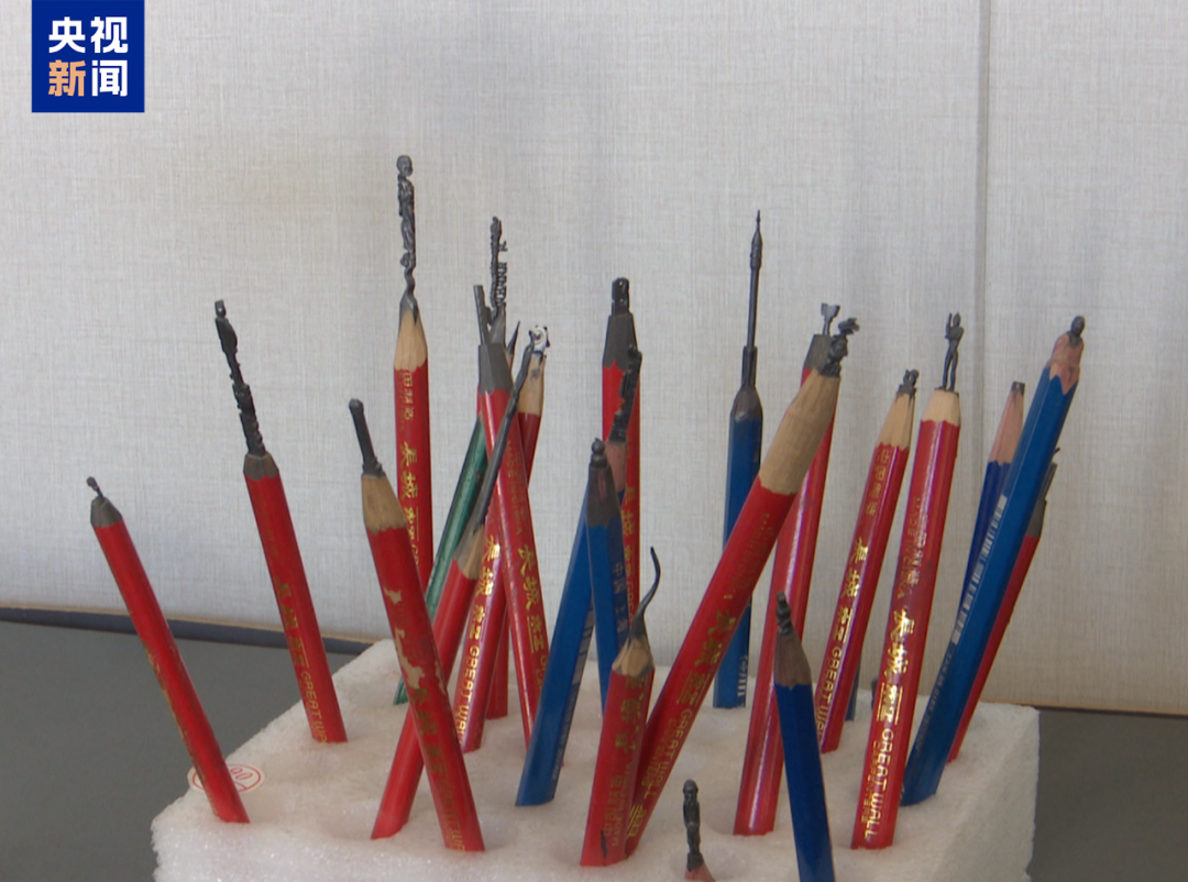 完成一件微雕作品少则几个小时,多则数天。令沈靖宇印象最深刻的是一个航天主题的微雕作品:一面是“中国航天”字样,另一面是三个身着太空服的航天员,细看上面还有国旗、火箭等元素,这些全被雕刻在了5毫米的铅笔芯上。