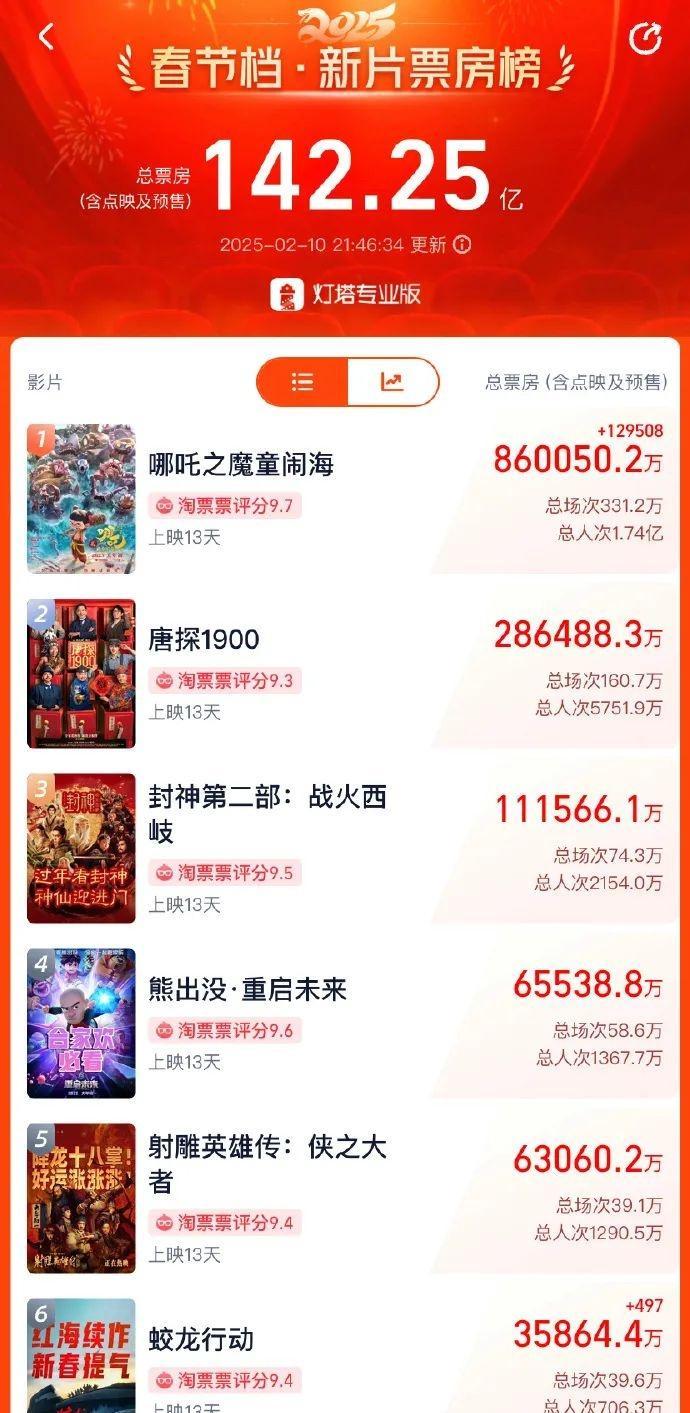另据灯塔专业版数据,截至2月10日21时46分,影片《哪吒之魔童闹海》总票房(含预售)突破86亿。