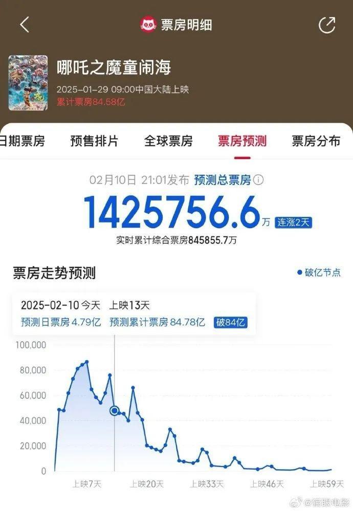 2月10日晚,据猫眼专业版预测票房数据显示,《哪吒之魔童闹海》最新预测总票房142.5亿,预测最终票房将登顶全球动画电影票房榜,冲击全球电影票房榜前七!