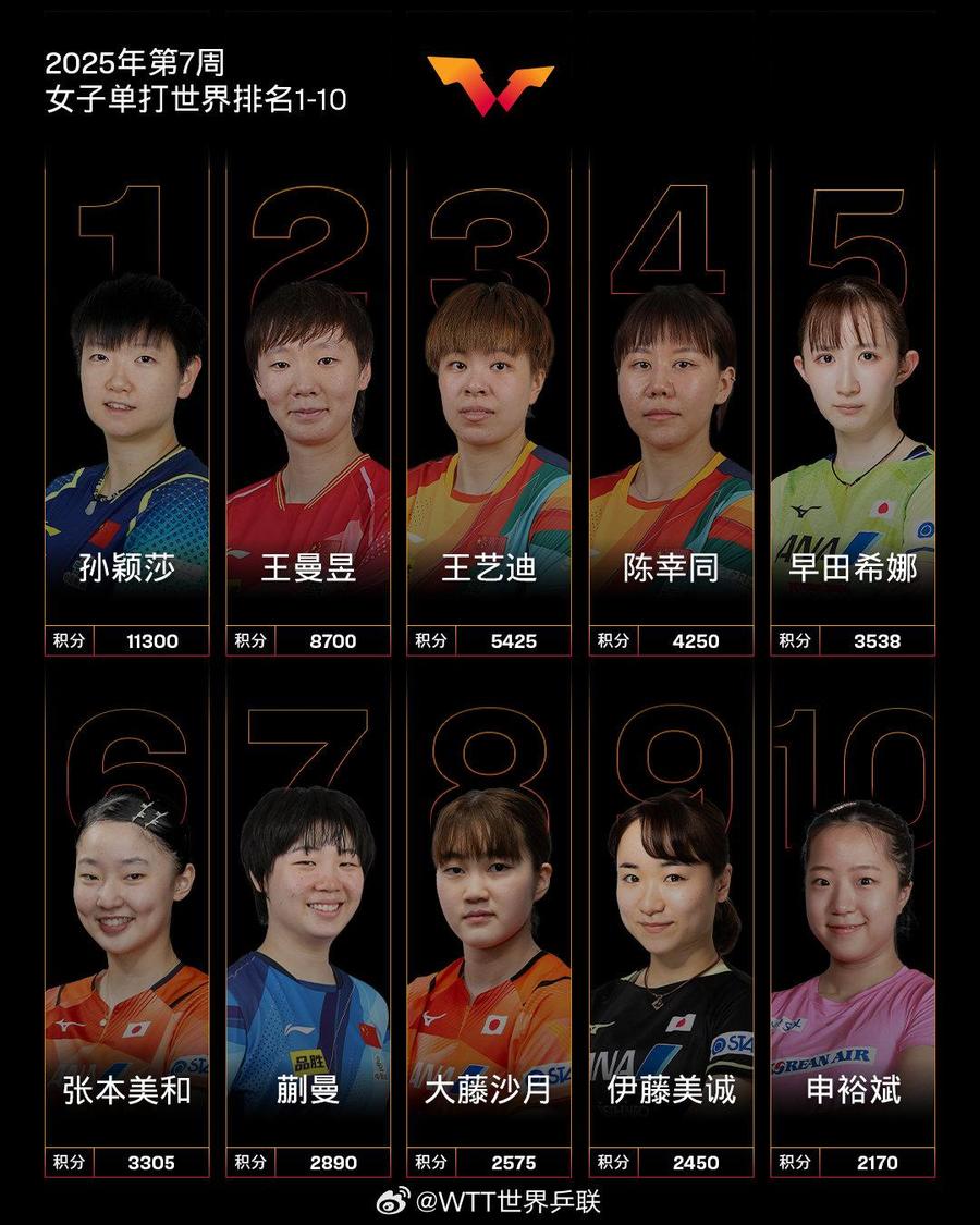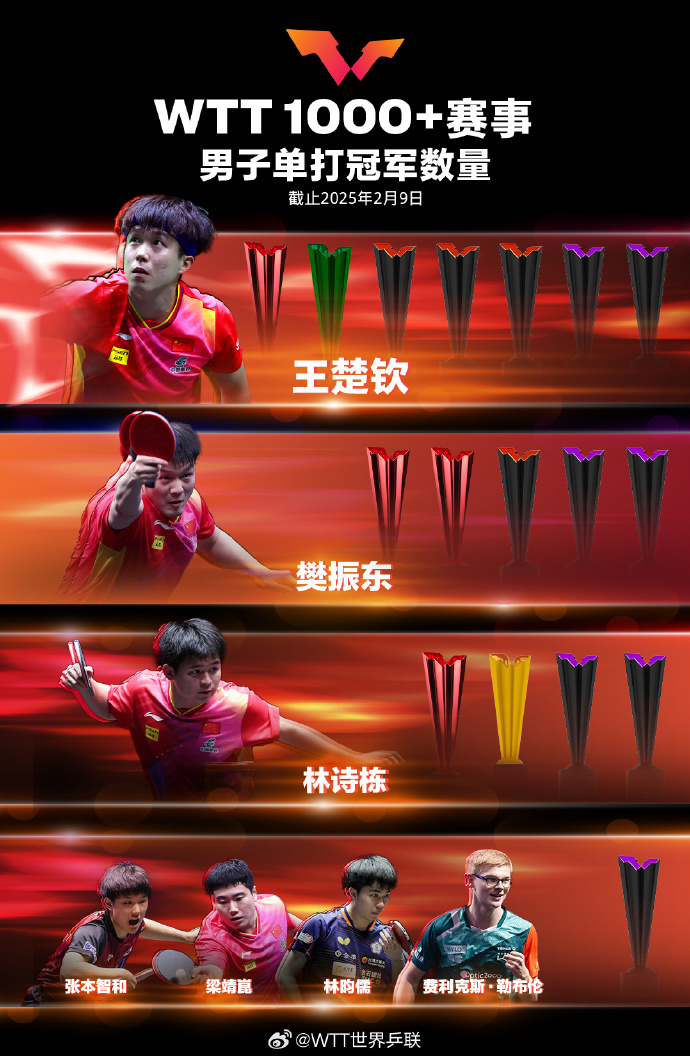 2月11日,@WTT世界乒联 发布最新一期WTT1000+冠军榜。