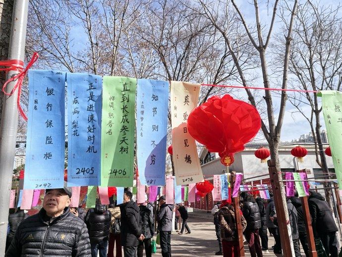 在二七路某大型商场,商家为吸引元宵客流,营造节日氛围,举办了有奖猜灯谜活动,线上线下同时进行,现场的灯谜前也是人头攒动,不少人津津有味地面对谜面琢磨起来。