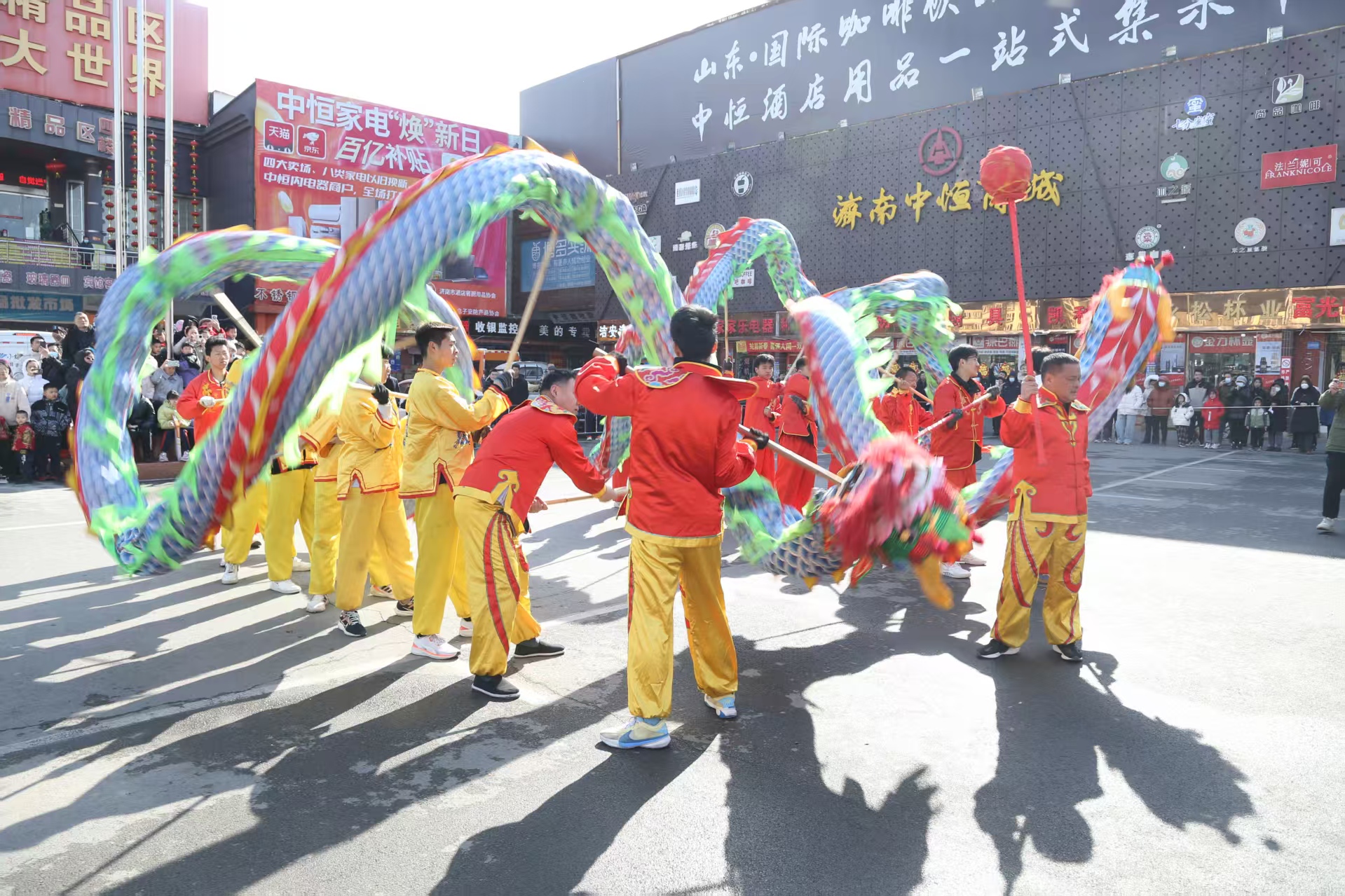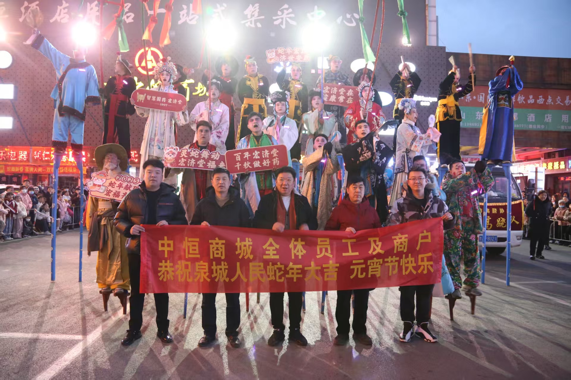 观高跷、赏花灯,舞龙狮,济南中恒商城2025元宵节花灯会盛大启幕,员工、商户和市民共庆团圆佳节。
