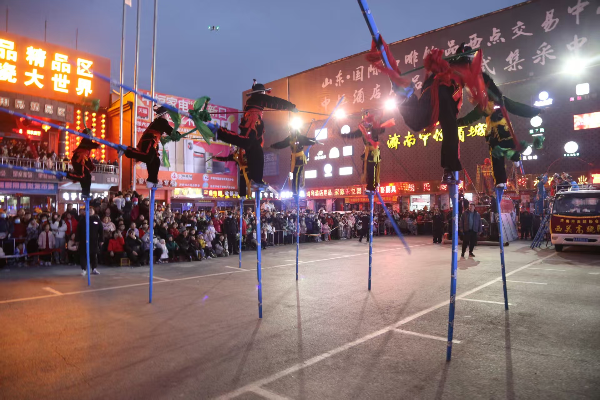 2月11日是农历正月十四,在中恒商城中心广场,举行了民俗高跷表演,传递了浓浓年味。踩高跷作为一项传统技艺,由于技巧性强,难度大,趣味幽默,奇特而惊险,很受观众的喜爱。铿锵的锣鼓声中,凭借着高超的技艺和精湛的表演,夸张艳丽的装扮,看着就喜庆、有趣。多种高难度表演动作惊险刺激,让观众看时揪着心、捏着汗,看后大呼过瘾。济南市西关高跷队可谓卧虎藏龙,高跷队员身怀绝技,扮相喜人,表演诙谐,引得现场观众连连叫绝,在为员工、商户和广大市民带来了惊险刺激的视觉盛宴的同时,也让大家在欢乐的气氛里感受着中国传统技艺的无穷魅力。