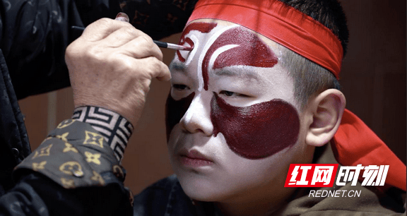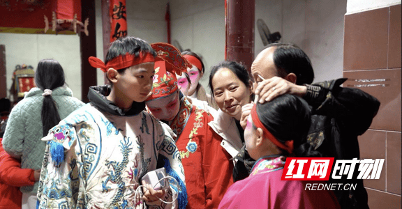 上午9时许,水波堂祖祠内已是一片繁忙。村中老幼齐上阵,村里的长辈们为演员勾画脸谱,油彩笔触间尽显传统技艺的细腻。