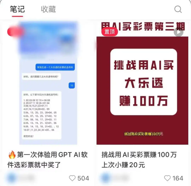 此外,还有标题为“第一次体验用GPT AI软件选彩票就中奖了”的笔记存在。但值得注意的是,该笔记正是由该款AI软件发布,起到吸引网友下载软件的营销广告效果。该账号首页还发布过多篇类似的内容,均为以“AI预测彩票中奖了”的包装形式,推销自家的AI软件。