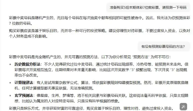 那么,对于用户关于预测彩票中奖号码的要求,各款AI软件到底是如何作答呢?记者就此向多款AI软件提问“准备购买10组本期双色球彩票,请预测一下号码。”DeepSeek的回答是:“双色球彩票的号码是随机生成的,无法进行预测。”文心一言的回答为:“任何试图预测彩票号码的行为都是没有科学依据的,且往往会导致不必要的经济损失。”豆包则回应:“购买双色球应该是基于娱乐目的,而并非一种可行的投资策略,不要过度依赖或盲目相信所谓的预测。”