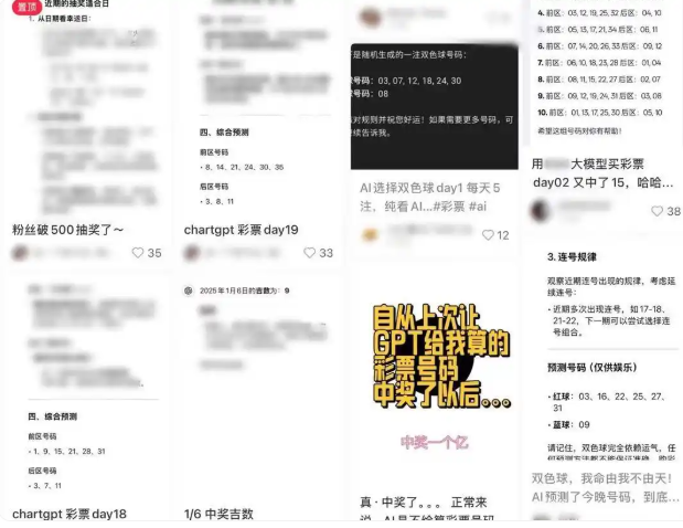 随着AI技术的不断发展,不少人将“AI赋能”的目光瞄准彩票、算命等领域,近日,“用DeepSeek买彩票中奖了”就冲上热搜。近日,来自安徽芜湖的李先生发帖称,自己按照DeepSeek推荐的号码来买双色球,真的中奖了。李先生称自己用5组DeepSeek推荐的数字下注,合计10元,其中一组数字中了“2+1”,也就是中了六等奖,奖金为5元。还有一位博主在社交平台上更新用ChatGPT买彩票的历程。从去年12月至今年1月,他累计有19天通过ChatGPT给出的“卦象”“吉数”提示购买彩票。记者翻阅其所有记录笔记发现,其每日收入均为负数,至今支出近二百元。但评论区有不少网友蹲守动态,还会“求推荐”,目前其粉丝数已经在短期内增长至近900个。