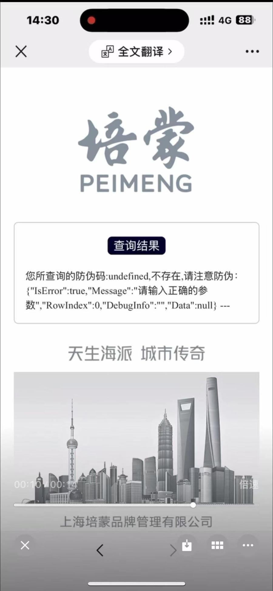 许林找到培蒙官方微信公众号,扫码验证吊牌防伪码结果显示,所查询的防伪码不存在,请注意防伪