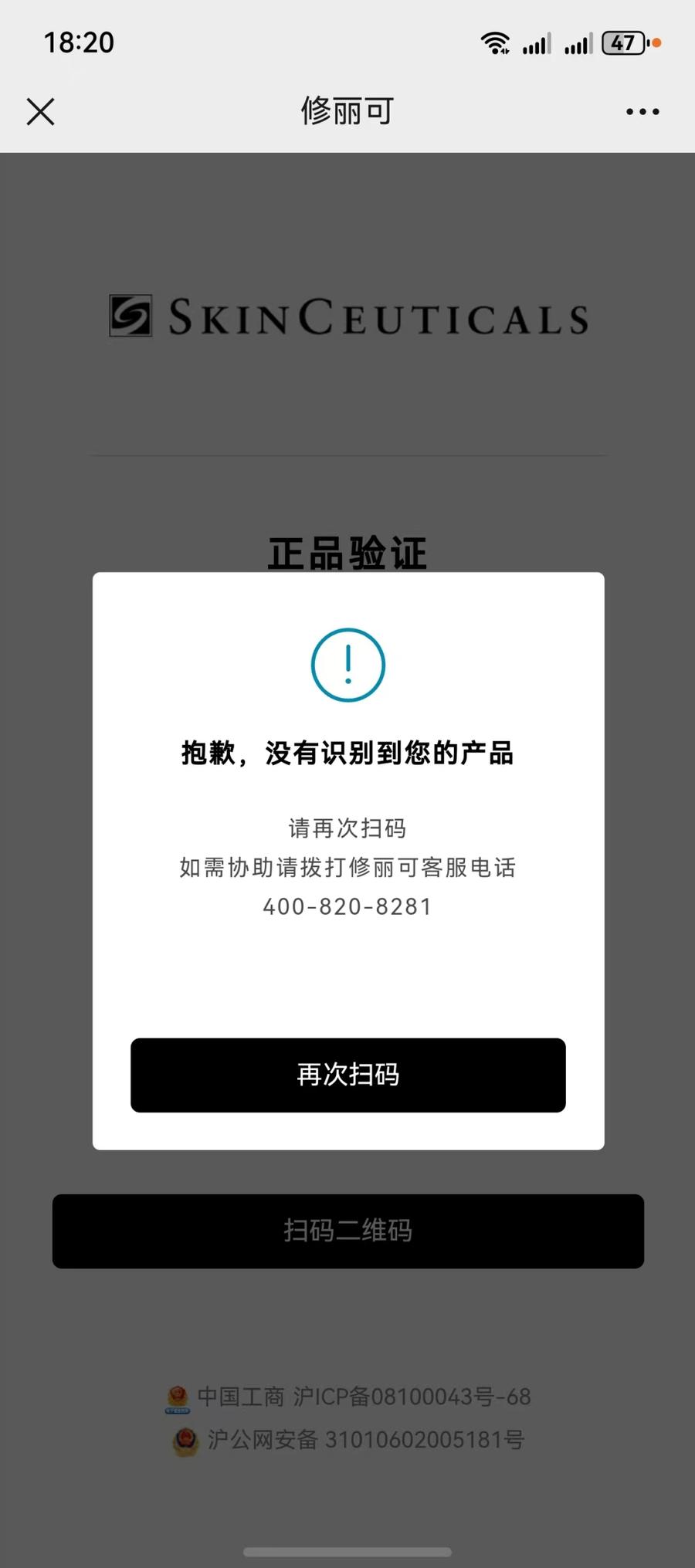 张女士在官方公众号扫描所购化妆品防伪码,结果无法识别