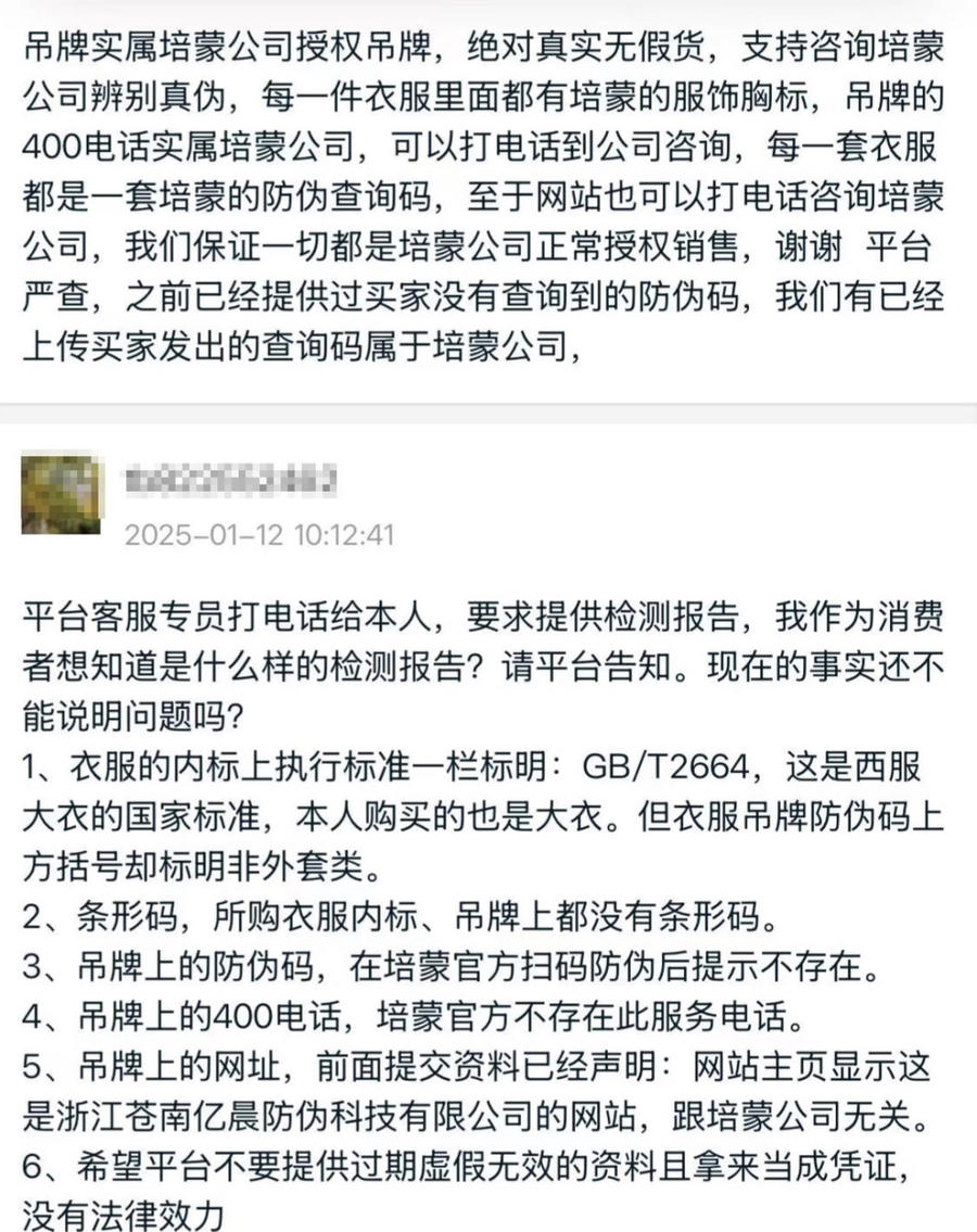 同样的,2025年1月11日,许林投诉至淘宝,随后卖家“培蒙男装轻奢服饰店”提供了反驳材料,包括培蒙的生产许可证品牌授权书和进货单。