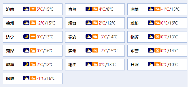 最高气温:菏泽和聊城16℃左右,鲁中山区和沿海地区11℃左右,其他地区14℃左右。