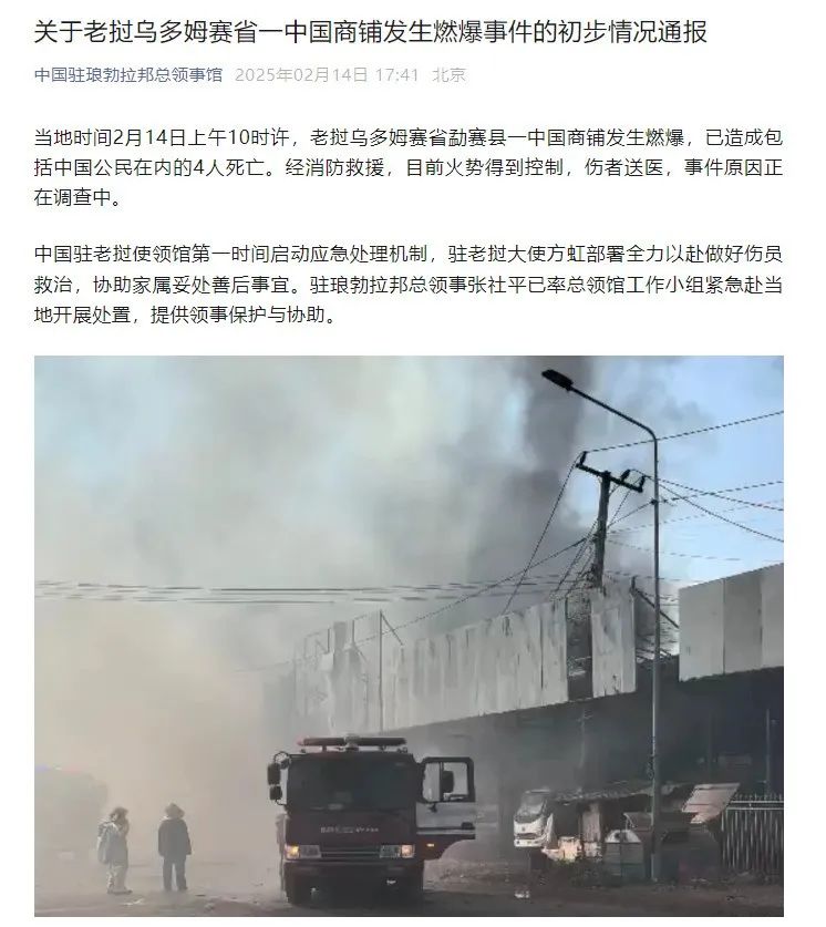 2月14日,中国驻琅勃拉邦总领事馆发布关于老挝乌多姆赛省一中国商铺发生燃爆事件的初步情况通报。