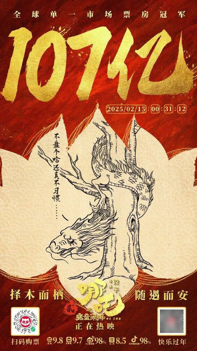 平台数据显示,2月13日19时09分,《哪吒2》全球累计票房(含预售)达。截至2月15日早, 《哪吒2》票房继续飙升至107亿, 全球动画电影排名第2,饺子导演电影总票房也超过157.38亿, 成为中国影史票房最高导演。