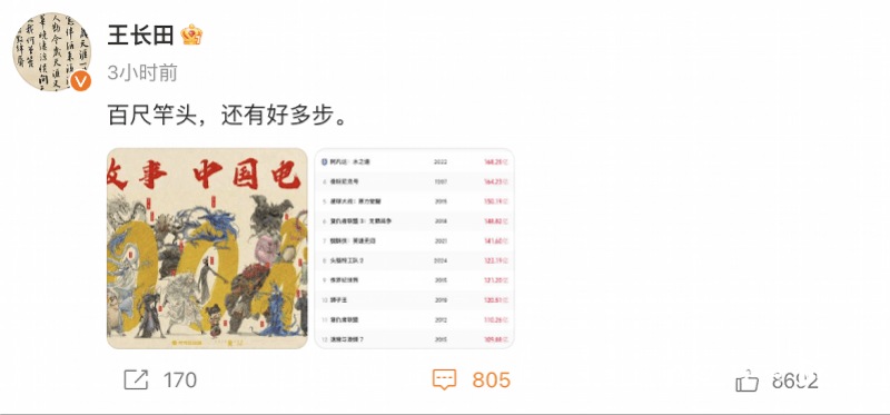 一路高涨的票房成绩,连带 光线传媒股价高涨20%,公司总市值达到近1019亿元。光线传媒董事长 王长田在当日晒出“全球影史票房榜”截图,《哪吒2》上升至第16位,对于百亿票房,他写道“百尺竿头,还有好多步”。