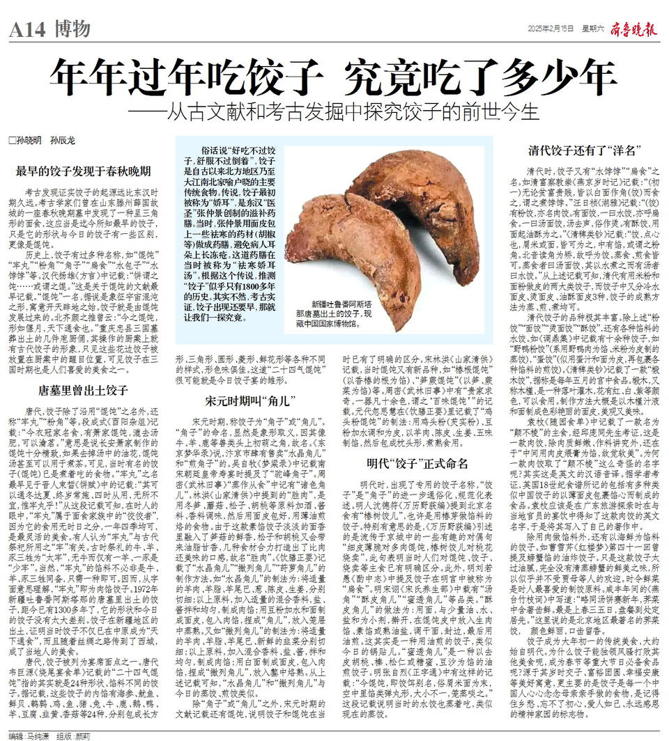 考古发现证实饺子的起源远比东汉时期久远。考古学家们曾在山东滕州薛国故城的一座春秋晚期墓中发现了一种呈三角形的面食,这应当是迄今所知最早的饺子,只是它的形状与今日的饺子有一些区别,更像是馄饨。
