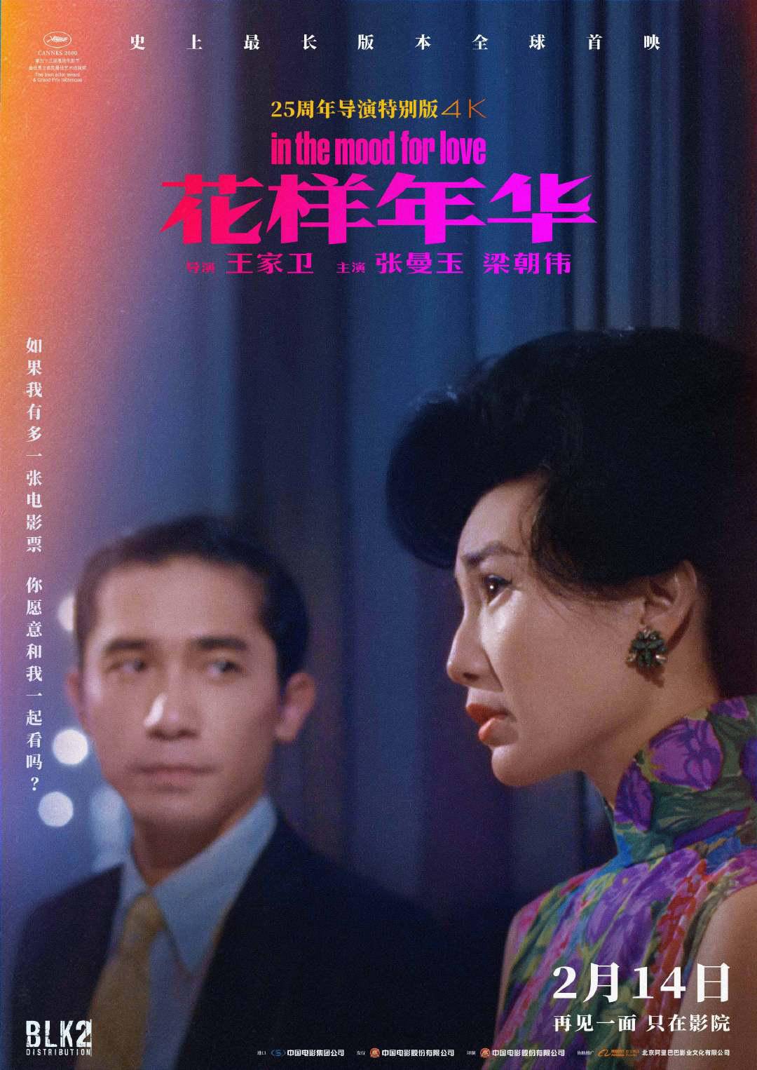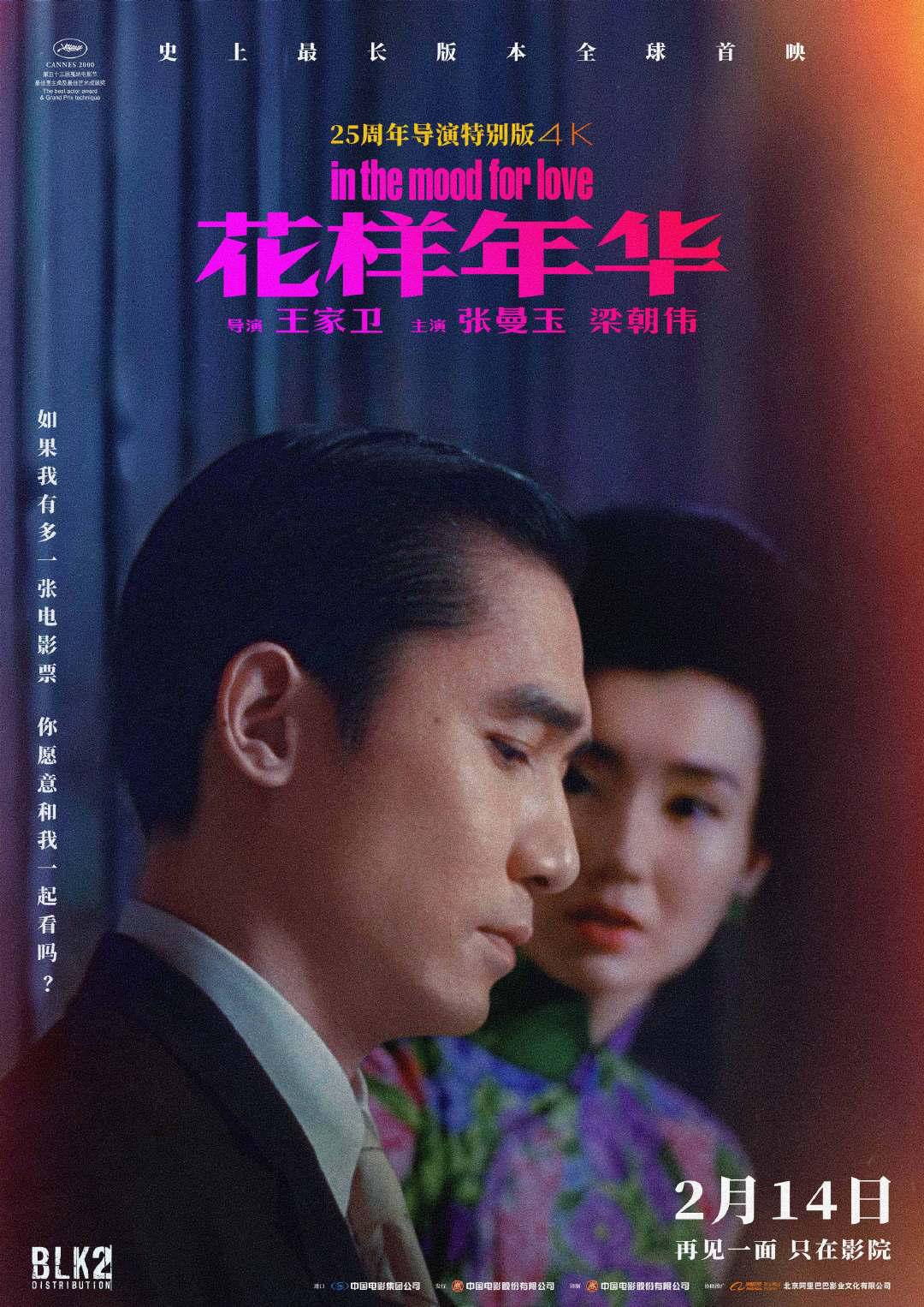 2月14日,由王家卫执导,张曼玉、梁朝伟主演,泽东电影有限公司制作的电影《花样年华》导演特别版正式上映。令人惊喜的是,王家卫不仅在导演特别版中加入了千禧年世纪之吻的全新片段,连物料都是从未曝光过的电影画面,视频中,兴趣相投、身处花样年华的苏丽珍与周慕云在影院相遇,十足浪漫。值得一提的是,梁朝伟也惊喜献声,“如果有多一张电影票,你会不会跟我一起走”。