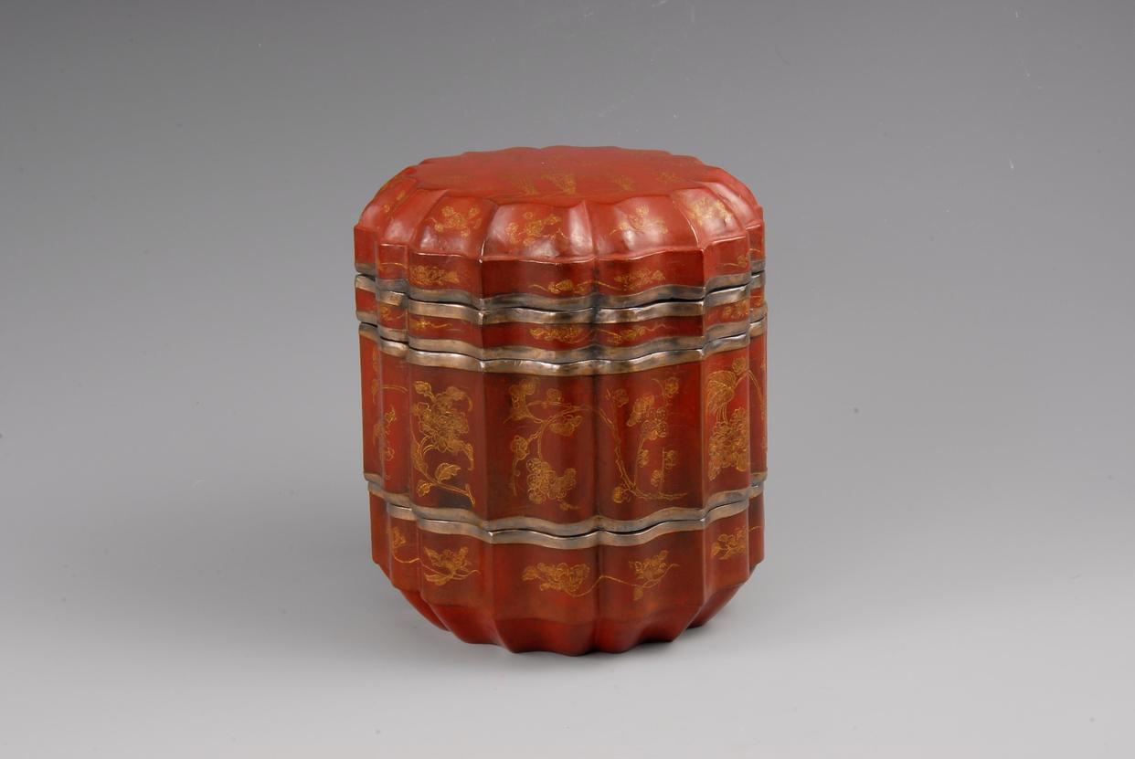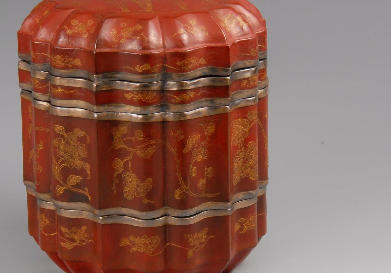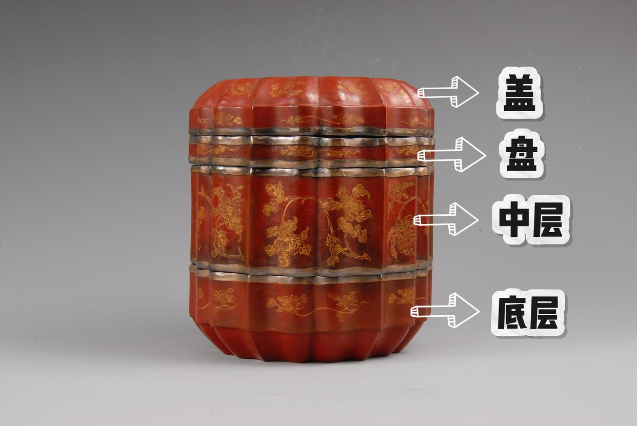 打开朱漆戗金莲瓣式人物花卉纹奁