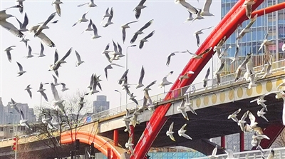 昨日,我市迎来风和日丽的好天气,海河金钢桥亲水平台上人潮涌动,成群结队的海鸥在河面上翱翔、栖息,与市民、游客共绘人与自然和谐共生的美丽画卷。近年来,随着天津生态环境的持续改善,加之市民爱鸟护鸟意识的提高,越来越多的海鸥选择在这里越冬,津城闹市区已然成为它们的“栖息家园”。