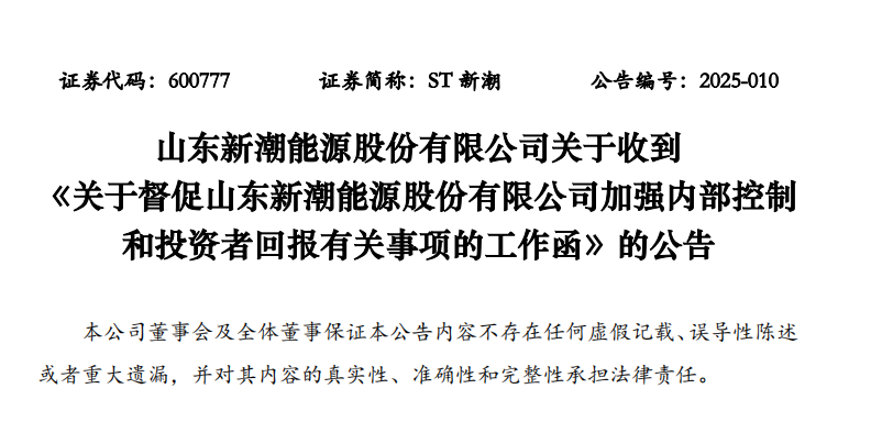 2025年2月18日,山东新潮能源股份有限公司(证券代码:600777,证券简称:ST新潮)发布公告称,公司收到上海证券交易所上市公司管理二部的工作函。