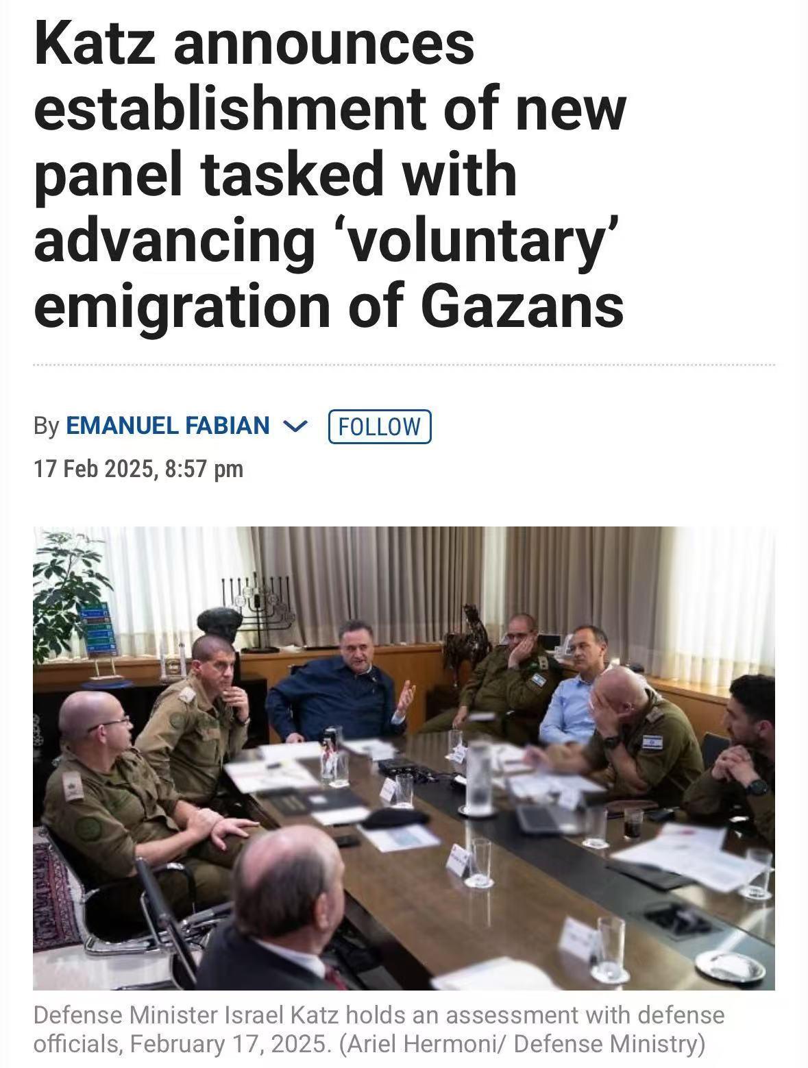 以色列国防部长卡茨17日宣布,将在国防部设立一个新部门,负责按照美国总统特朗普提出的计划,让巴勒斯坦人“自愿”离开加沙地带。这一计划包括所谓广泛的援助,允许任何想要移居第三国的加沙居民获得支持,包括通过海上、空中和地面进行特殊离境安排等。