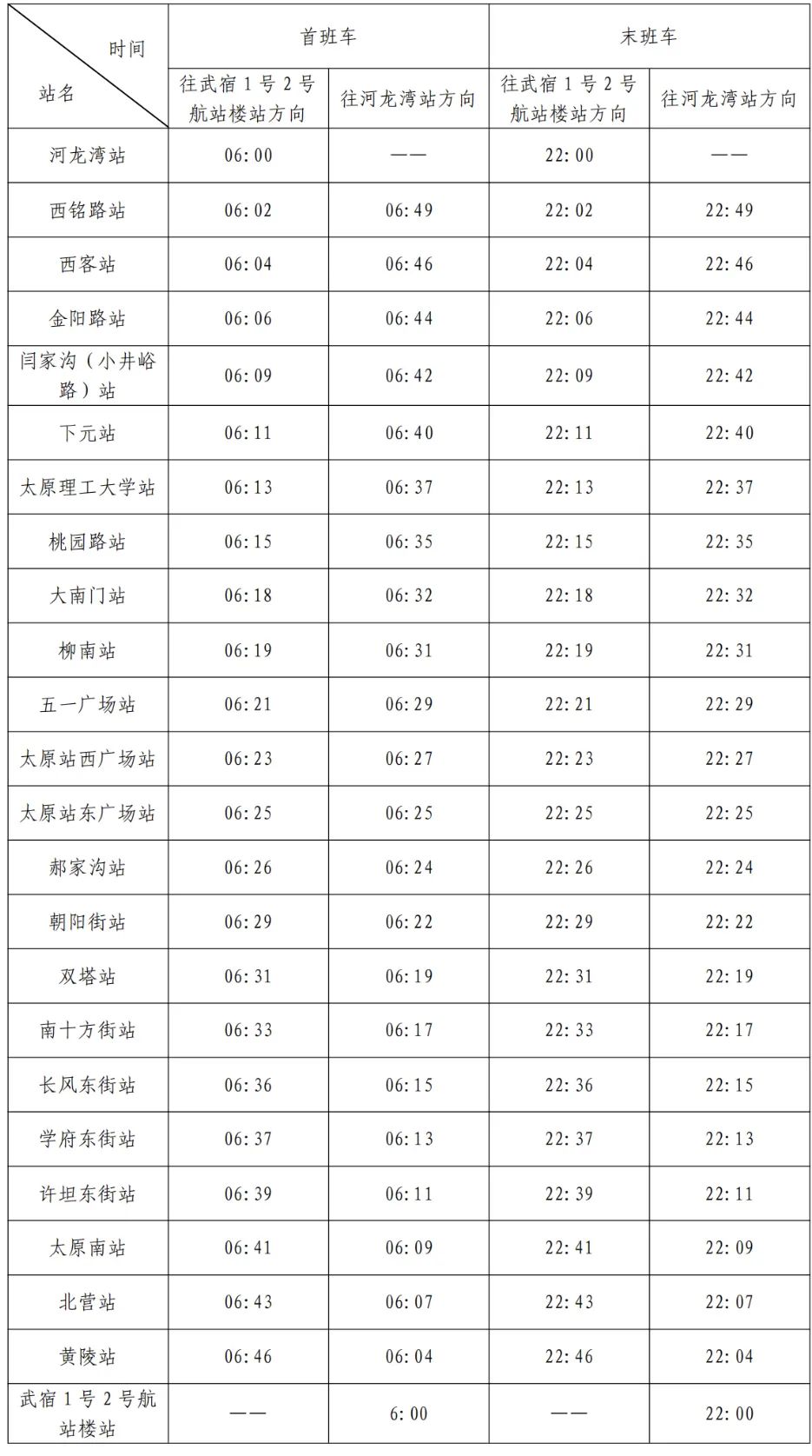 武宿1号2号航站楼站往河龙湾站方向为:6:00-22:51