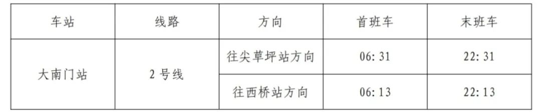 各站首末班车时间在站外导向和站内电子显示屏、公告栏内公布,请乘客合理安排出行时间。